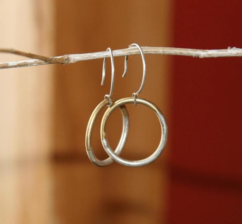 1″ diameter hoops, half gold filled, half sterling silver brushed to a fine luster. Open french wires.
