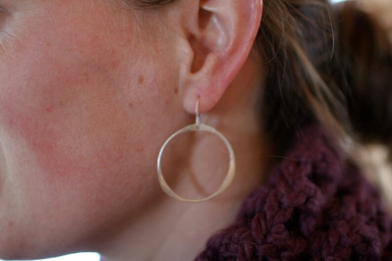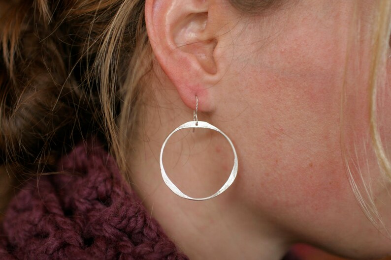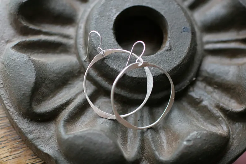 Unique-shaped flattened silver hoops with an endearing and irregular cutout. 1 3/8”, sterling silver wires.